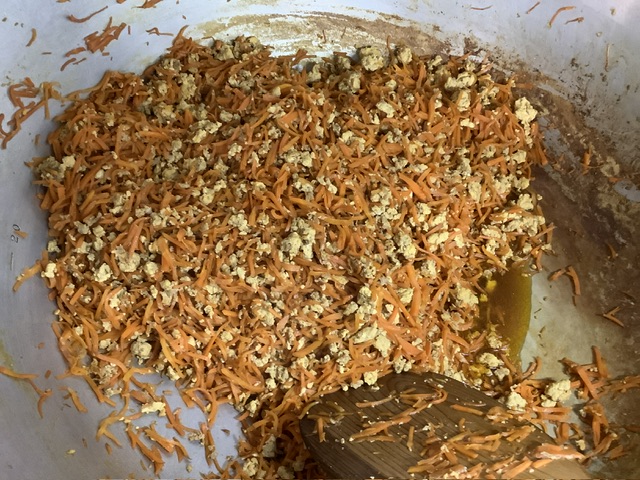 千切りのにんじんをツナと炒めて、炒り卵を加えます。