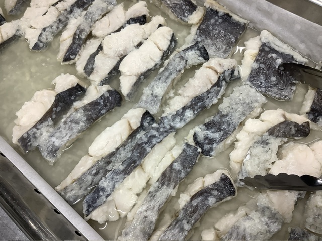 山口水産のホキを使い、給食室お手製の塩麹で漬け込み、スチームで蒸しました。