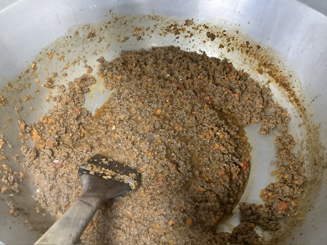 みじん切りにした生姜とにんにくを米油で炒め、合挽肉・みじん切りの玉ねぎ・にんじん・トマトと一緒に炒めていきました。