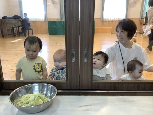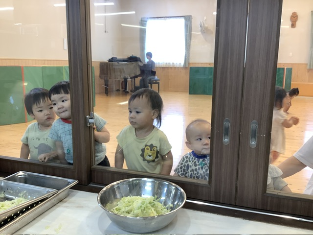 給食を作っていると、お隣のランチルームからさくらんぼ組のこども達が覗いていました。