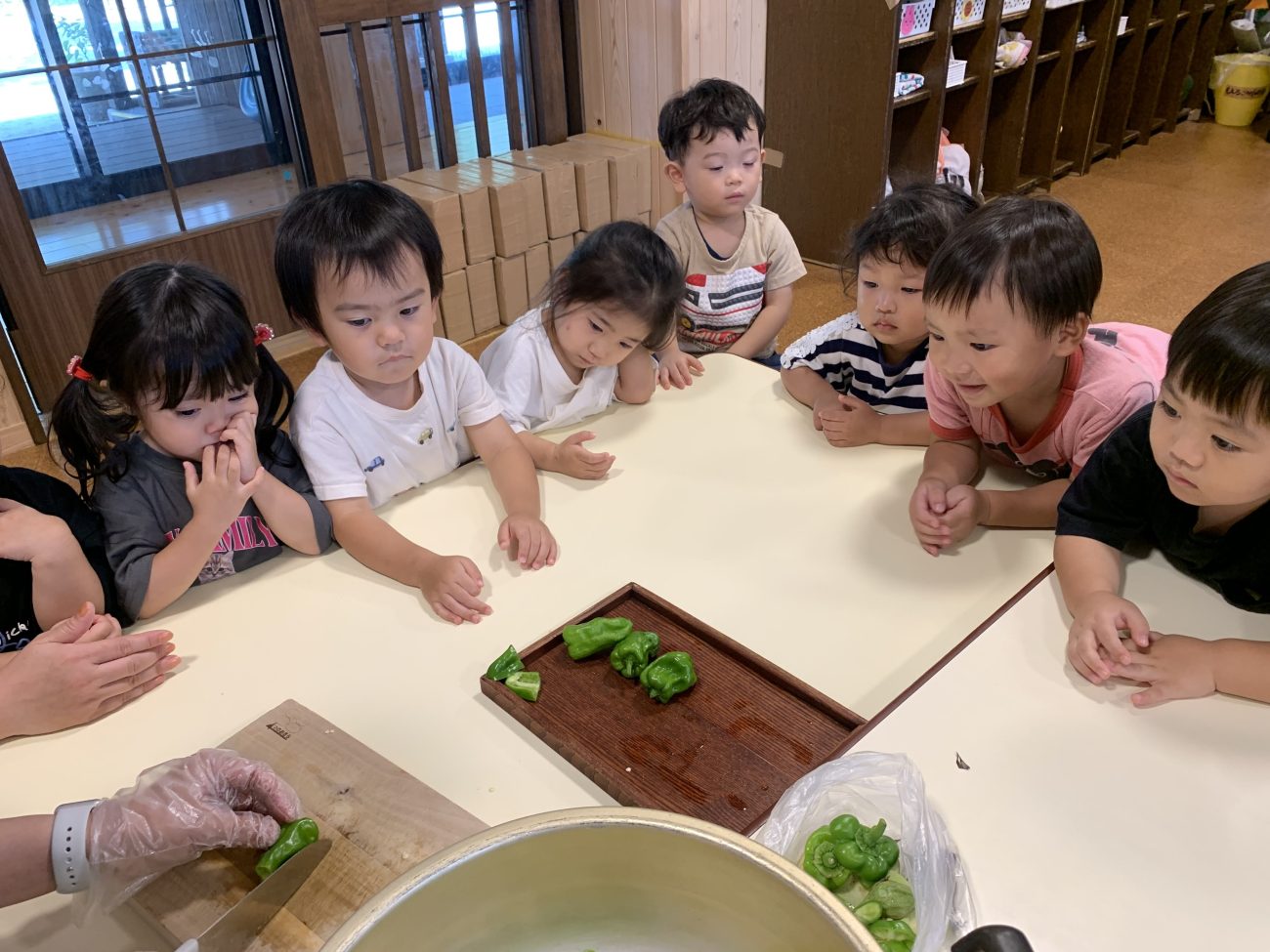 7月にようやく一つ実り、こども達は「ピーマンができた!」と大喜び!!収穫したピーマンは、塩昆布炒めのクッキングをして食べました。