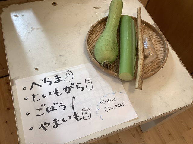 へちまやといもがらなど、普段あまり見慣れない野菜に、こども達は「とうもろこし?」「ねぎ?」と答えていました!