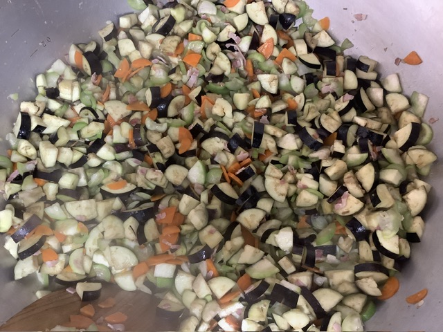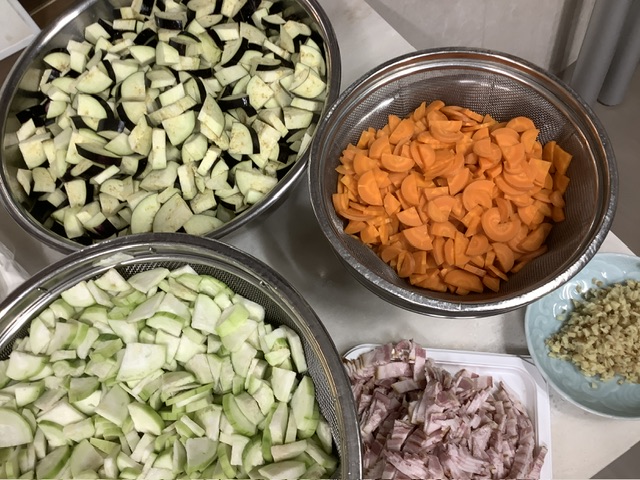 へちま・35ファームのなす・にんじん・南州農場のベーコンを一緒に炒めました。