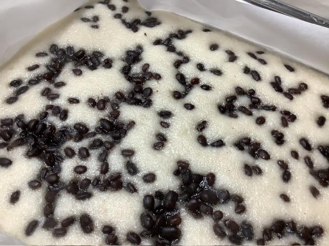 大きな鉄板に生地を流し入れ、仕上げに甘納豆を散らしてスチームで蒸しました。