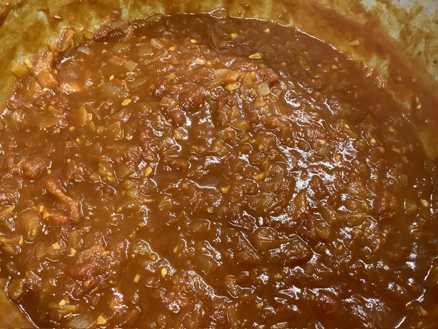 みじん切りにしたにんにくと玉ねぎを、ホールトマト、カレー粉、洋風だしで煮詰め、味を整えます。