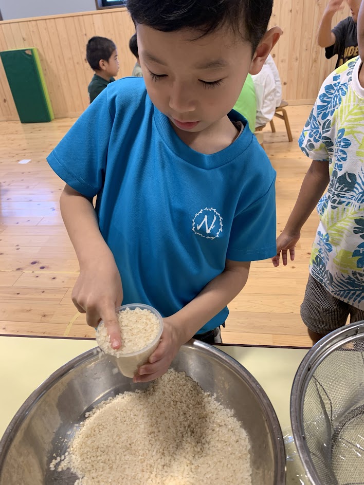 毎回、給食室から1日に食べるお米(10合)を全てもらい、自分たちでお米を研ぐところから始めます。