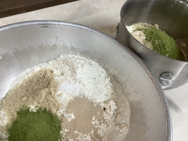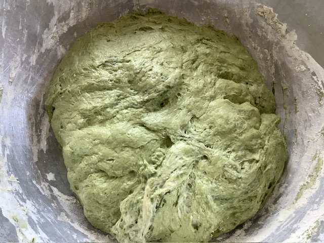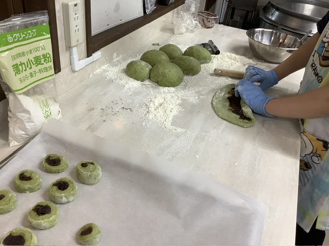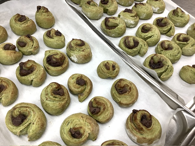 今日は、国産の抹茶パウダーを生地に練り込みキレイな緑色の生地になりました。