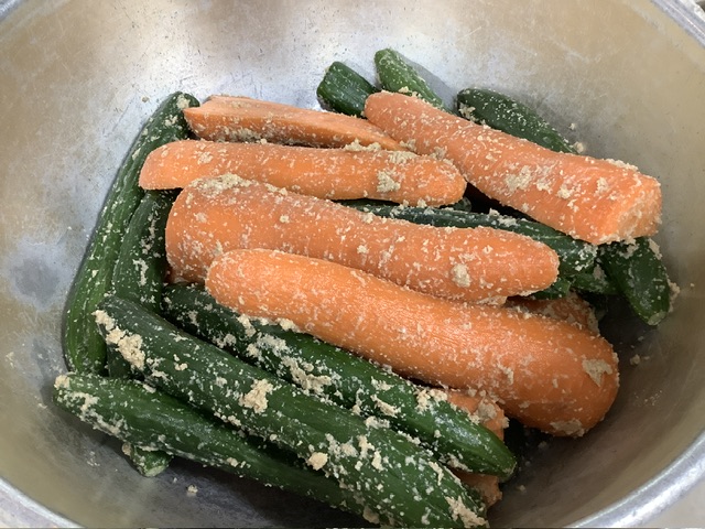 ぬか床にきゅうりと人参を漬け込んで、給食室手作りのぬか漬けを提供しました。