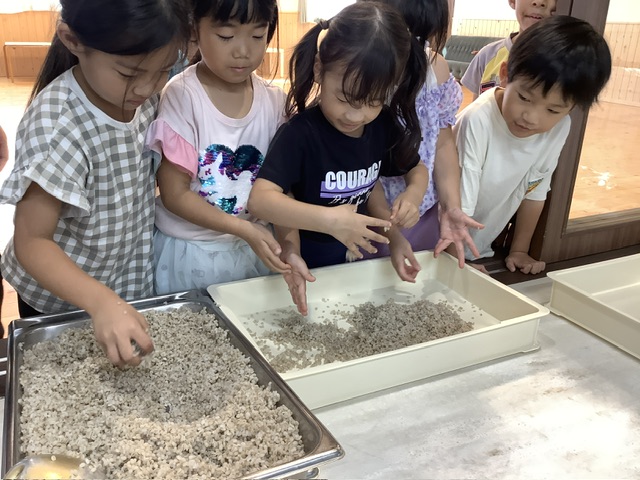 「ごはんみたい」「納豆みたいなつぶつぶだね」「手にくっつく!」と思い思いの感想を教えてくれました。