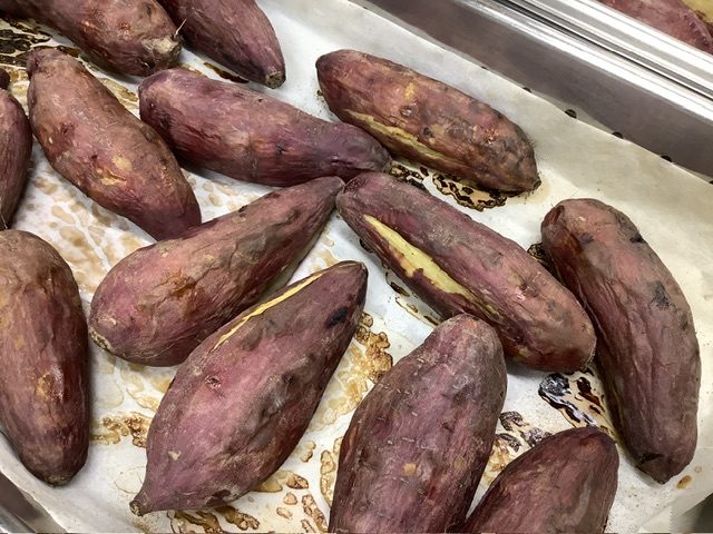 焼き上がる頃には、給食室中に甘い香りが広がって、鉄板の上にさつまいもの蜜が溶け出しました。