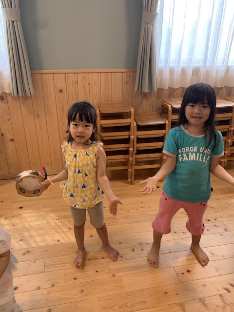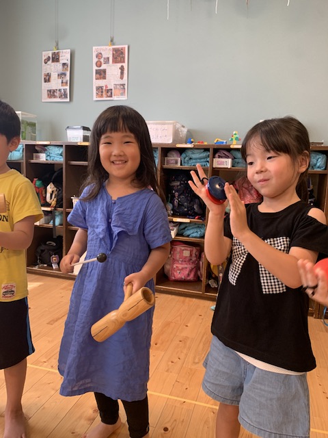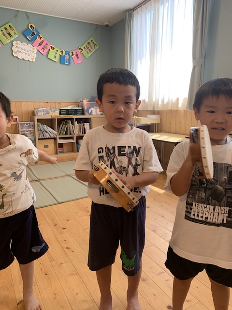 楽器遊びの回を重ねるごとにやってみたい!が増えていく子ども達。「今日はこれ!」というように、まだ使ったことのない楽器があると、目を輝かせて手を伸ばしています。「僕、歌うたいたい!」と自分の声で表現する子もいます♪使ったことのない大太鼓、小太鼓、ピアノ(キーボード)まだまだ子ども達のやってみたい!が尽きることはなさそうです。