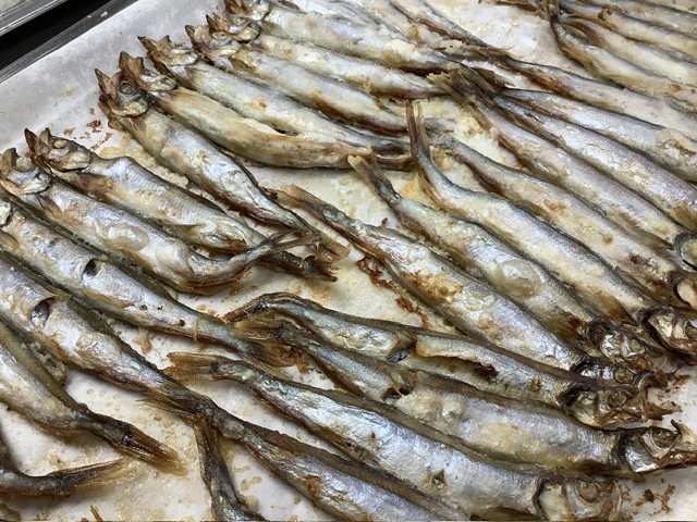 ししゃもは頭から尻尾まで丸ごと食べられるため、カルシウムなど栄養満点の魚です。尻尾の部分や骨が少し口に残りやすいですが、このように揚げ焼きにすることでカリッと噛み切りやすくなります。