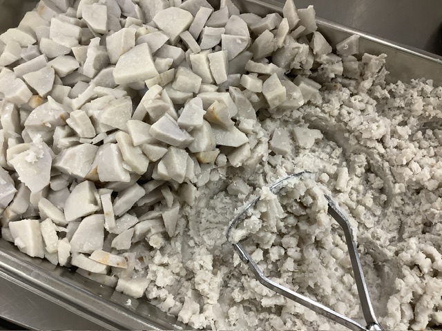 里芋をスチームで加熱してマッシュし、だんご粉(米粉)・きび糖・水を加えて丸く成形しました。