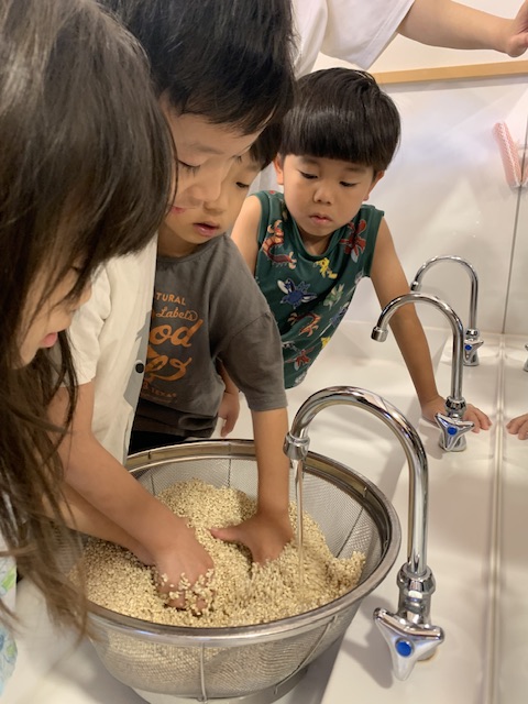 おにぎり作りでお米を研ぐことが上達し、丁寧に麦とお米を洗っていました。