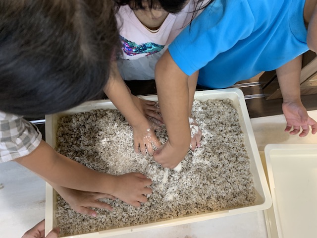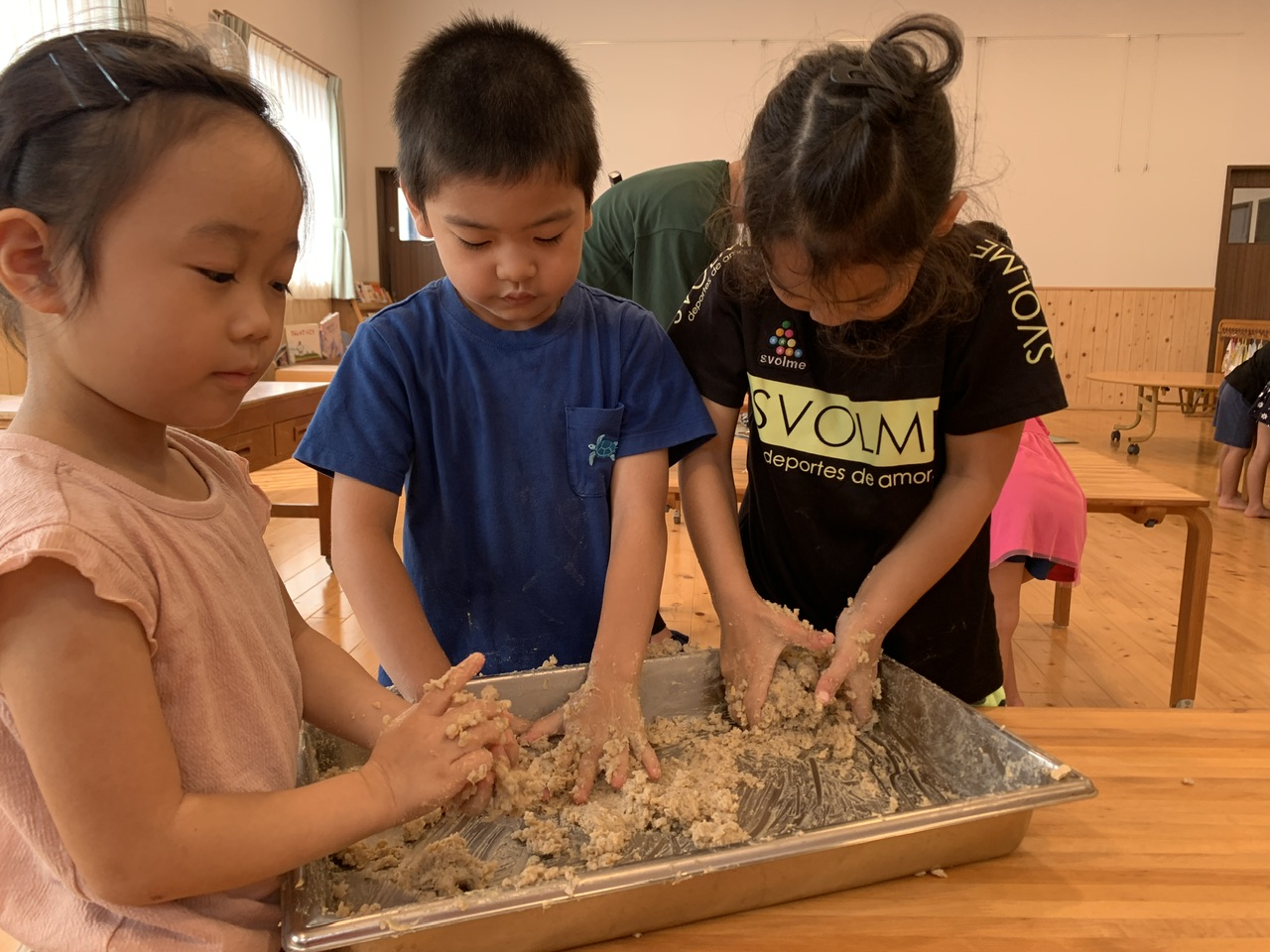 袋から出した麹の状態は匂いなくサラサラの粉で、子どもたちは「塩みたいだね」と話しながら、全体に麹を混ぜ込んでいました。