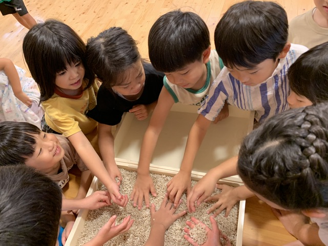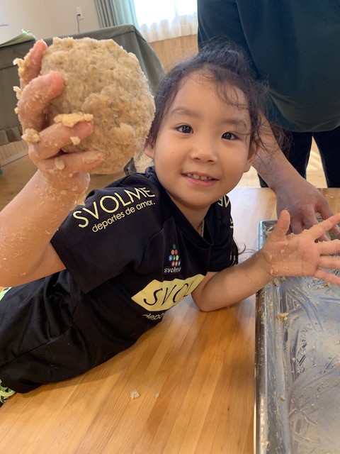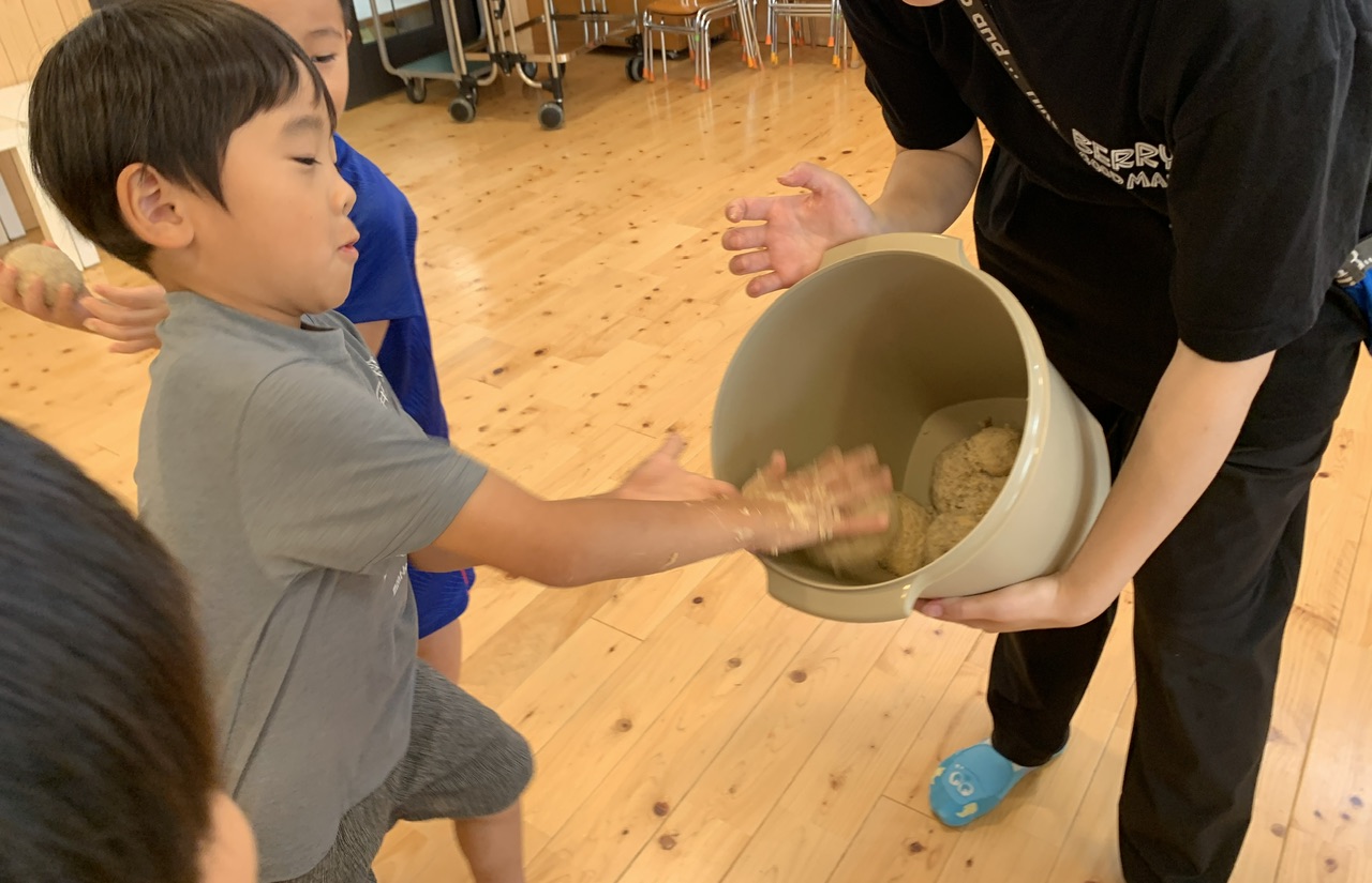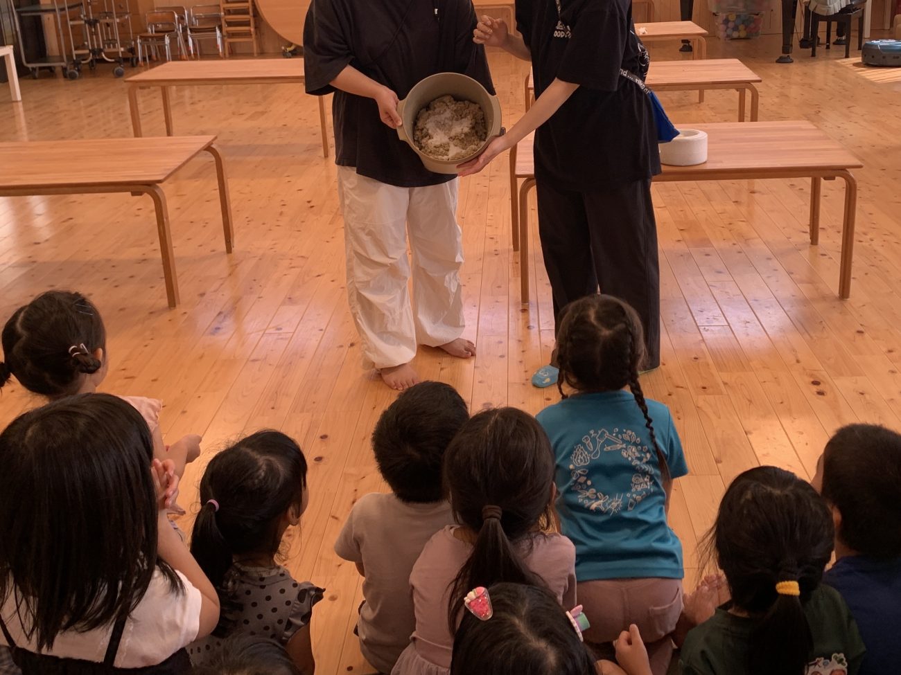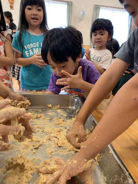 4日間を通して味噌に使われている食材を知り、味噌になるまでの手間暇や食材の変化を楽しく五感で感じていました。活動後には、子どもたちから「味噌汁にしたい!」「豚味噌おにぎり作ってみたい!」という言葉が出てきた姿に、味噌から食への興味が広がっていることを感じ嬉しく思いました。今後も私たちは、この子どもたちの食への興味を支え、子どもたちが大きくなった時の生活の豊かさに繋がればと思います☺️