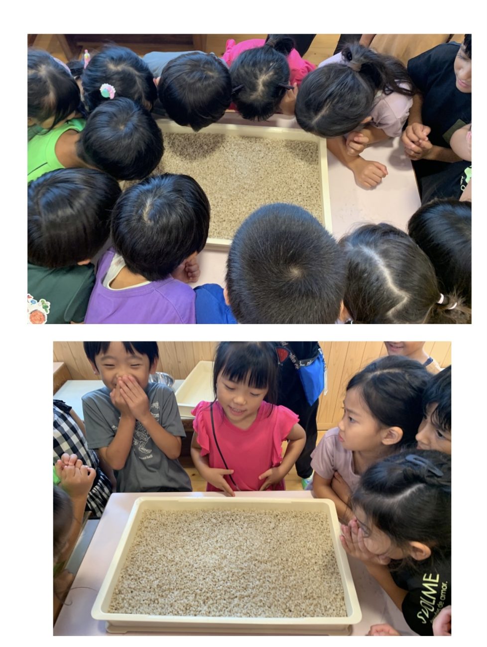 保育者:「今日のお米と麦はどんな匂い?硬さは?明日はどうなっているかな?」