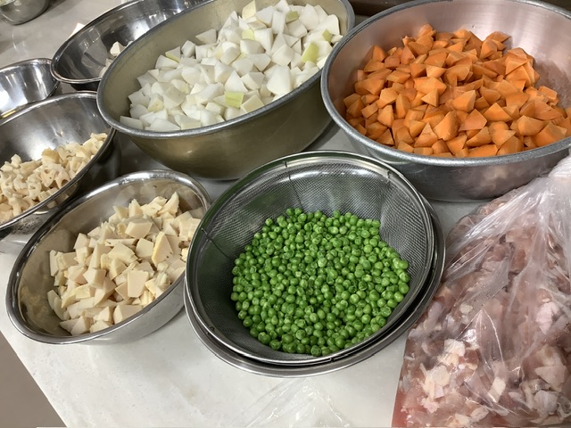 筑前煮には、鶏肉、大根、にんじん、れんこん、椎茸、たけのこ、グリンピース、蒸しごぼう、里芋、高野豆腐が入りました。