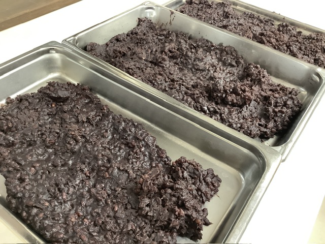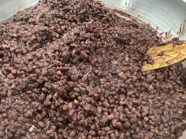 きび糖が入り最初は照りがあったアンコ。水分が飛んで照りがなくなれば出来上がりです。