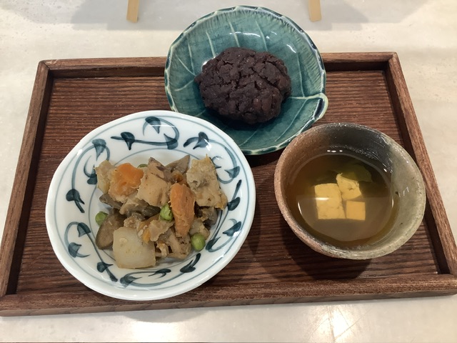 この期間は、あの世とこの世がもっとも近づくとされ、お墓参りや仏壇の掃除、お供えなど霊前で手を合わせるのが習わしとされています。今日の給食は、精進料理の筑前煮、おはぎを取り入れてみました。