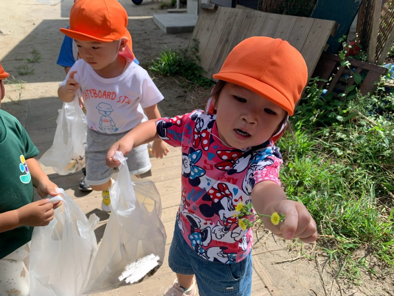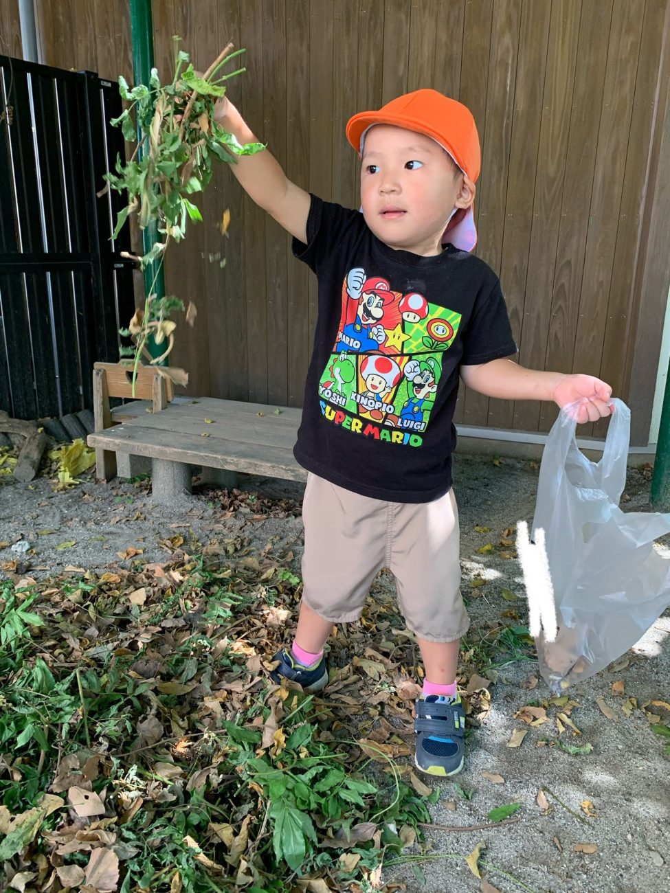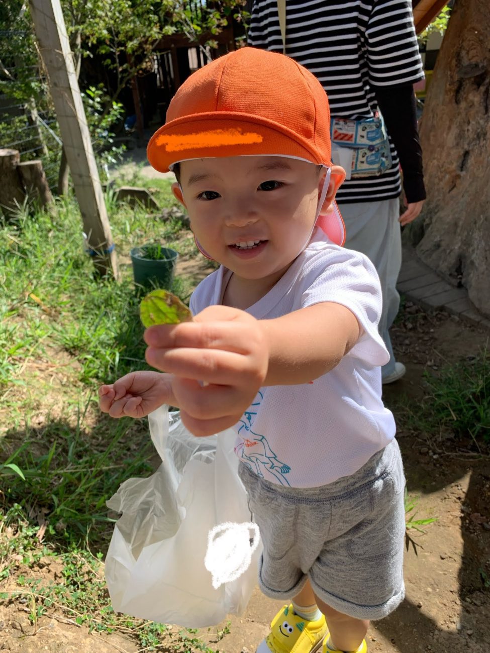 一人一枚ずつビニール袋を持って、葉っぱ探しにもでかけました。