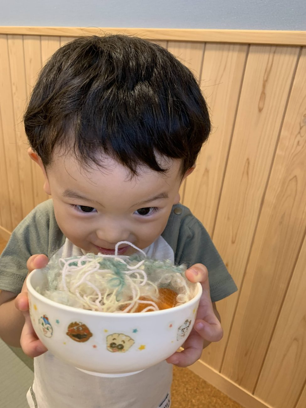 「毛糸だよ」と伝え、遊び方は伝えずに見守っていると「ちゅるちゅるみたい!」とスパゲッティに見立て始めました。