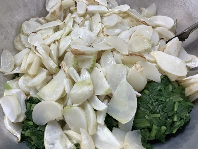 秋に旬を迎えるかぶと、35ファームの小松菜、南州農場のウィンナーでサラダを作りました。