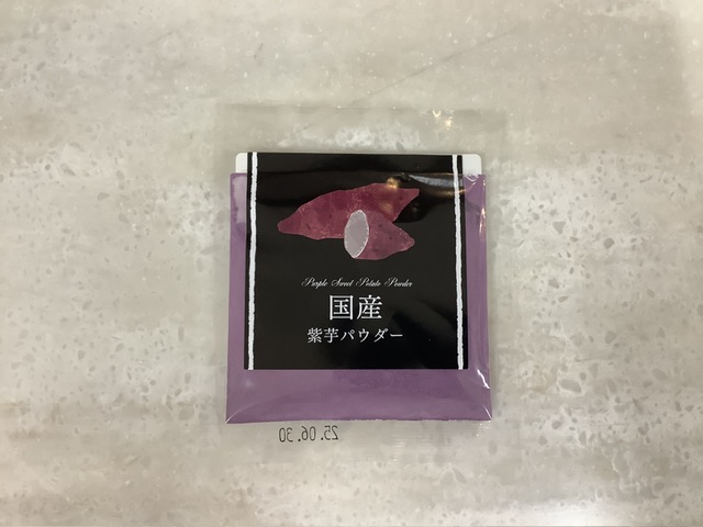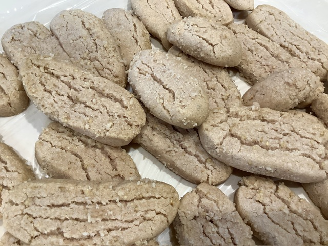 今日のおやつは手作りの紫芋ちんすこうです。薄力粉・きび糖・紫芋パウダー・米油・白ごまを混ぜて生地を作り、楕円形に成形して170℃のオーブンで焼き上げました。