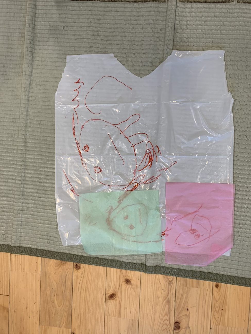 絵を描くことが大好きな子どもたちは洋服に好きな絵をデザインしたり、お姫様や戦隊ヒーローが好きな子どもたちは、様々な素材を使ってリボンやひらひらスカート、戦隊ヒーローの仮面を表現したりと、一人ひとり自分なりにイメージした洋服をつくっていました。