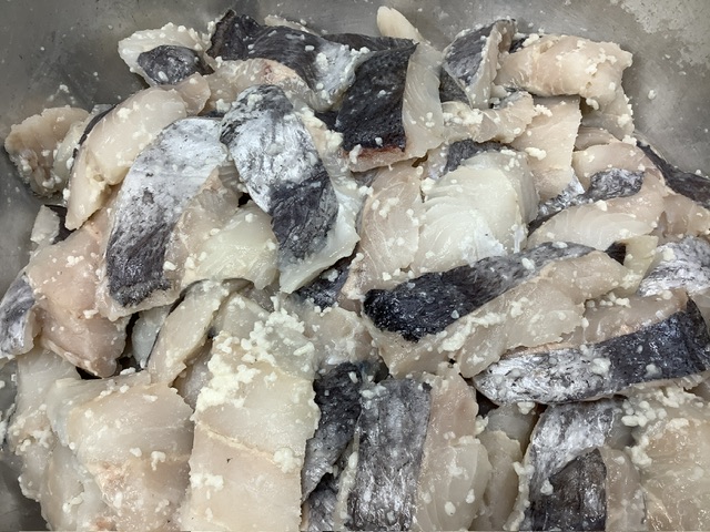山口水産から届いたホキという魚を、給食室手作りの塩麹に漬け込んでオーブンで焼き上げました。