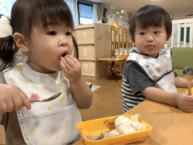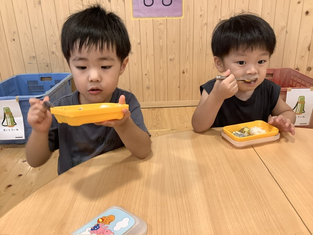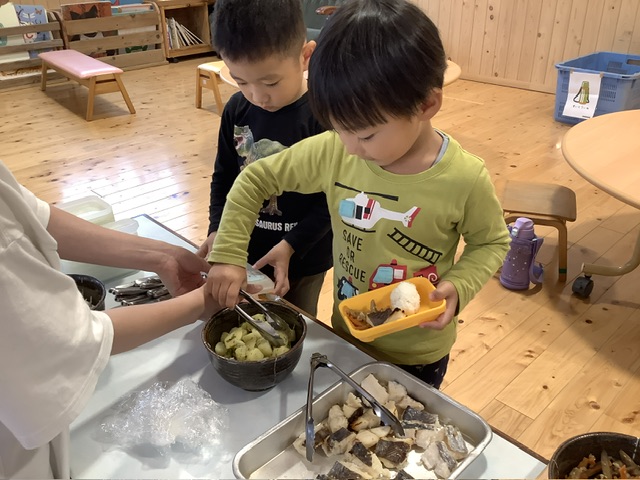 また、きく組のこども達は自分たちの手で配膳をしました。自分たちの手でランチボックスに盛り付けると、達成感も食欲も増しているようでした!