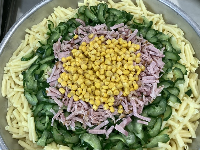マカロニ、きゅうり、南州農場のハム、コーン、手作り豆乳マヨネーズで和えました。