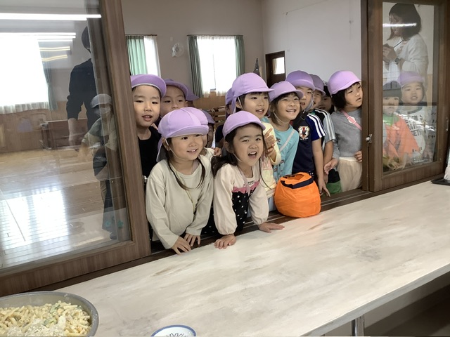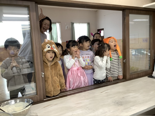可愛いこども達が、給食室にやってきました。いたずらをされては困ります!給食室からお菓子のプレゼントを渡しました。
