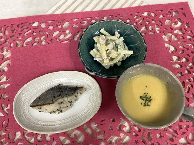 バジル、すりおろしにんにく、塩胡椒、白ワインに漬け込み蒸します。にんにくとハーブの香りが部屋いっぱいに広がります〜。あっさりとしたヒラスとハーブの相性抜群!ご飯が進む仕上がりでした。