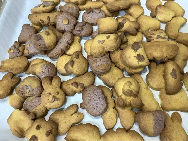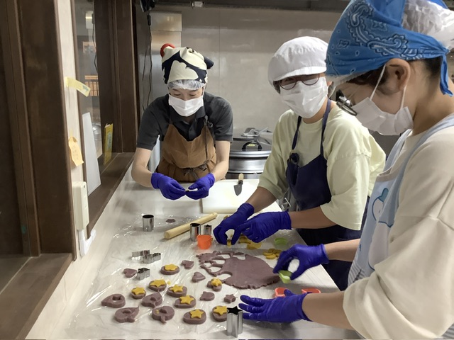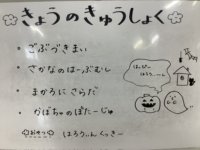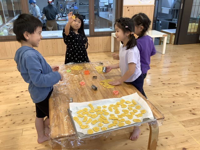 今日はハロウィン。こども達のために、型抜きを給食室メンバー総出で頑張りました!