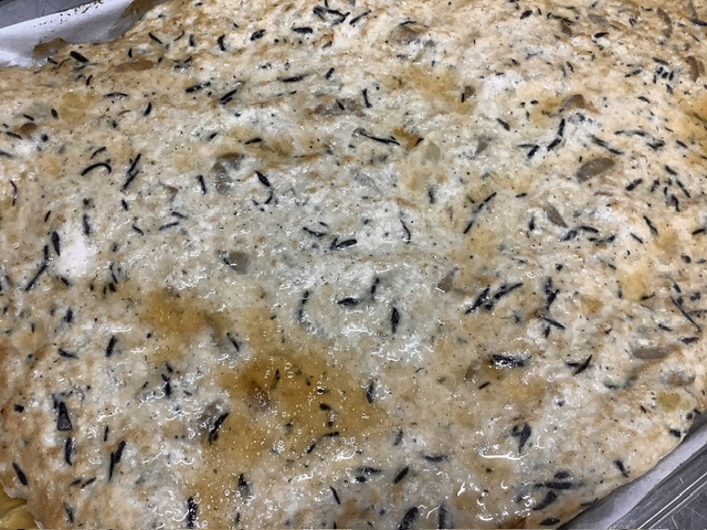 鶏ひき肉に蒸し煮をしたごぼう・ひじき・おから・玉ねぎを混ぜ、濃口醤油・きび糖・味の母で味付けをし、オーブンで焼き上げました。