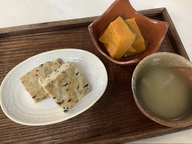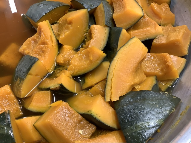 昆布とかつお節から取った出汁に、きび糖・薄口醤油・味の母を加え、ごろごろと大きめに切ったかぼちゃをじっくり煮込みました。