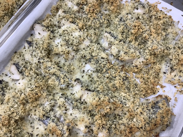 すりおろしニンニクとバジル、パセリ、粉チーズ、パン粉を混ぜたものを、塩胡椒を振ったホキにまぶして、スチームコンベクションで焼きます。