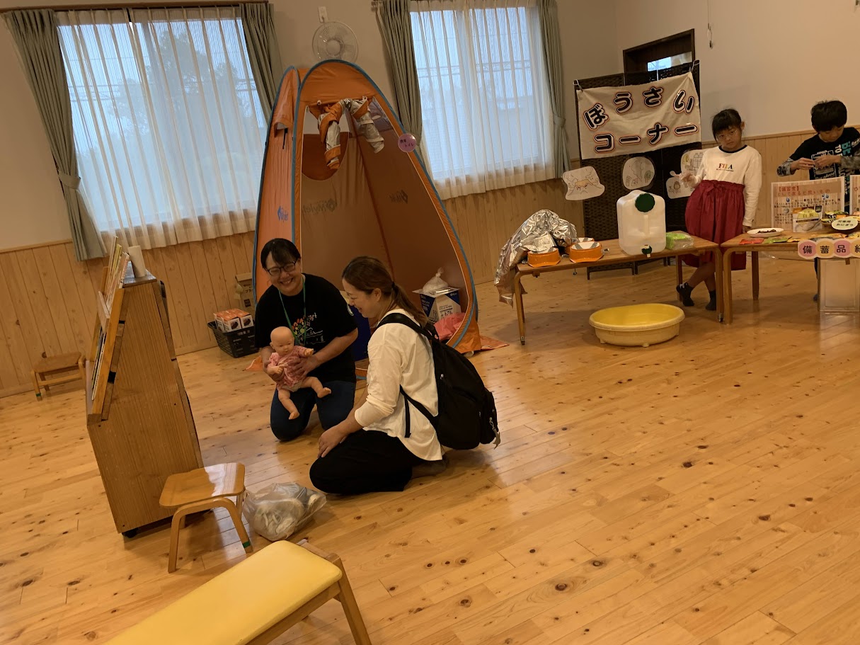 園の防災グッズの紹介や、防災頭巾や折り畳みヘルメット、避難時の仮設トイレなどを体験して頂きました。