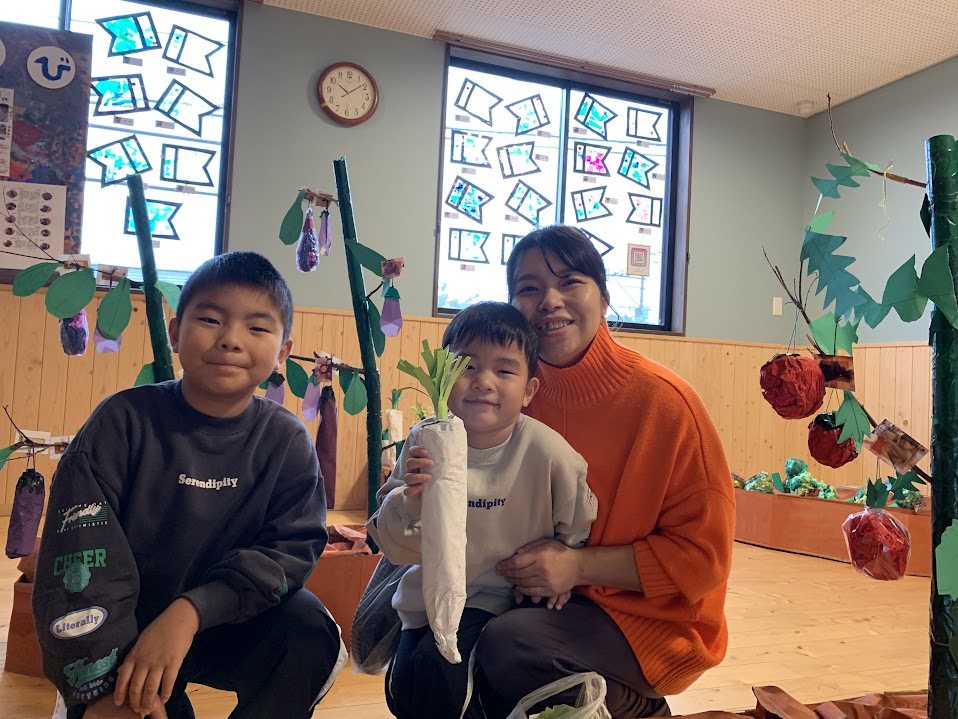 生き物や植物を育てる活動を行ってきたもも組は、裏にある畑の野菜作りをイメージして”もも組ファーム”での野菜の収穫体験と園外保育で行ったプラネタリウムを保育室に作り上げました。夜空や星をイメージした作品に保護者の方々とも会話が弾んでいました。