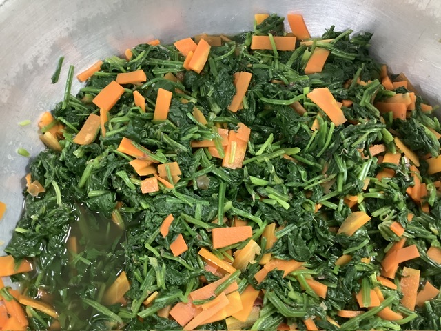今日はほうれん草と人参を使用しましたが、揚げ焼きしたナス、カボチャやカブなど、どんな野菜を入れても簡単に美味しいお浸しに仕上がるので、ご家庭でも是非作ってほしい一品です。