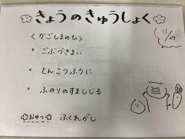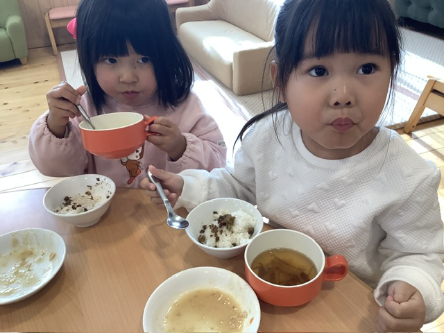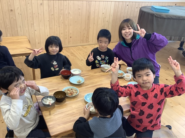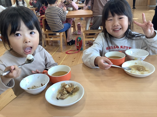 豚骨風煮をご飯にのせて、何度もおかわりする子もいましたよ。「椎茸がコリコリしてる」など、食感を楽しむ様子もみえました。錦ヶ丘で食べた、鹿児島の郷土料理がこども達の記憶に残ってくれたら嬉しいなと思います。