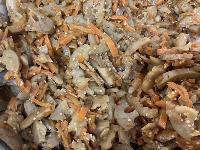 今日はこのれんこんとにんじんをごま油で炒め、きび糖・濃口醤油・味の母・酒で味を調えました。シャキシャキとした食感が楽しめるきんぴらに仕上がりました。