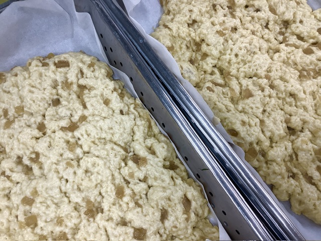 本日のおやつはりんご蒸しパンでした。角切りにしたりんごをコンポートのようにきび糖で甘く煮て、蒸しパン生地に混ぜ込みました。