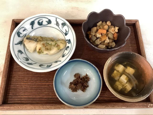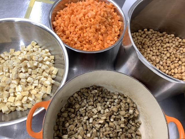 五目煮は、にんじん、蒸しごぼう、油揚げ、大豆、昆布のきざみの5つの食材で作りました。