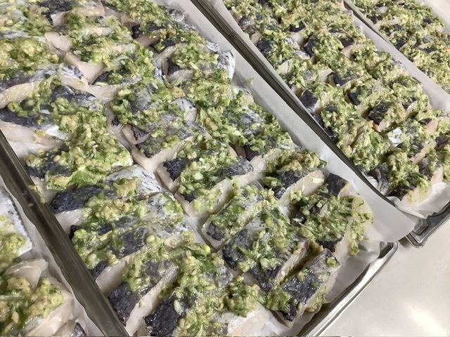 このホキに塩こしょうと酒をふりかけ、ミキサーでミジンにしたねぎと味噌、酒、みりん、きび糖、ごま油を混ぜ合わせたねぎ味噌を塗り焼き上げました。