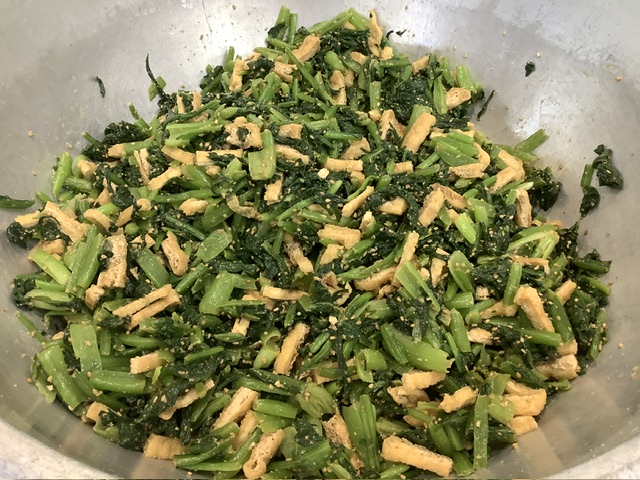 小松菜と、カリッと焼いた薄揚げを胡麻和えにしました。小松菜の苦味がありますが、薄揚げと胡麻の香ばしさが食欲をそそります。