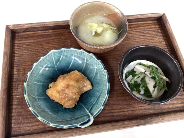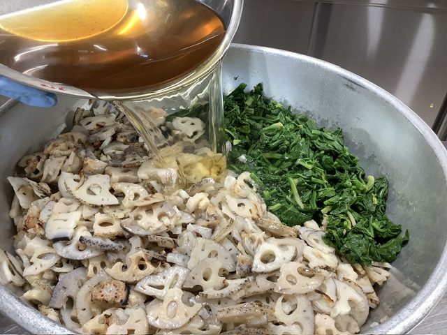 献立では「ブロッコリーとレンコンの煮浸し」でしたが、35ファームのほうれん草が収穫できるということで、「ほうれん草とレンコンの煮浸し」に変更しています。