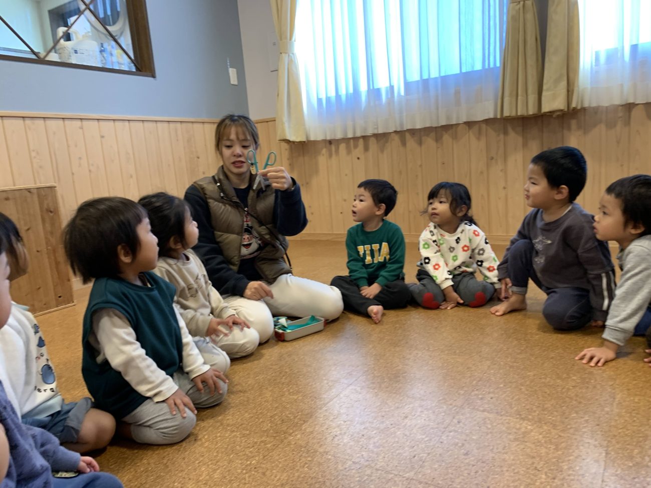 ハサミを見せて「上と下、どっちが危ないでしょうか!」と聞くと答えがまばら。「キラキラしている方が危ないよ。ちょっきんできるのは下の方だけだよ」と最初に伝えました。