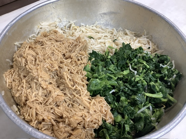 給食室手作りのなめ茸と、スチームしたニラ、もやしを合わせます。さっぱりとして、箸休めに丁度良いおかずですね♪